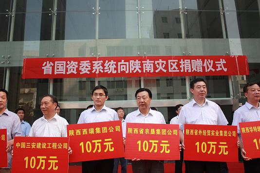 陜南災(zāi)區(qū)群眾的情況深深的牽動(dòng)著陜西省外經(jīng)貿(mào)實(shí)業(yè)集團(tuán)全體員工的心,8月4日早上,省國(guó)資委系統(tǒng)國(guó)有企業(yè)向陜南災(zāi)區(qū)捐款儀式在省國(guó)資委大樓前隆重舉行,副省長(zhǎng)姚引良、省國(guó)資委黨委書(shū)記白阿瑩出席了儀式。陜西省外經(jīng)貿(mào)實(shí)業(yè)集團(tuán)李鳳成副總經(jīng)理代表集團(tuán)公司向陜南災(zāi)區(qū)捐款10萬(wàn)元,以實(shí)際行動(dòng)支持陜南災(zāi)后恢復(fù)重建和突破發(fā)展工作。